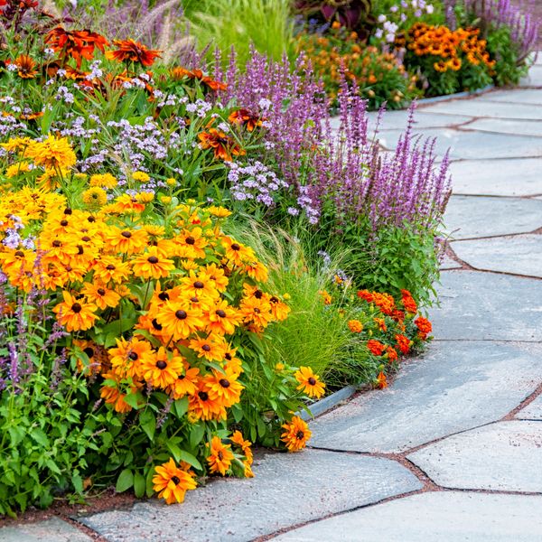 a stone wall can create plant bed definition and prevents loss of mulch into the sidewalk